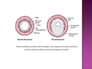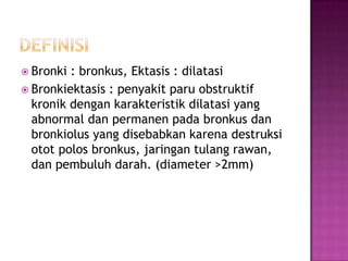 Bronkiektasis adalah penyakit paru obstruktif kronik yang ditandai dengan dilatasi bronkus akibat destruksi jaringan, dengan prevalensi yang berbeda antara negara barat dan Indonesia. Penyebabnya meliputi infeksi berulang, aspirasi, dan kondisi kongenital, dan gejala utamanya antara lain batuk kronis, hemoptisis, dan sesak napas. Penanganan dapat dilakukan melalui pengobatan konservatif, pembedahan, dan tindakan preventif untuk mencegah penyebab yang mendasarinya.