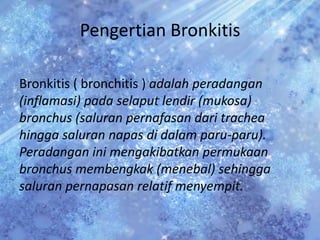 Bronkitis akut adalah peradangan ringan pada selaput lendir bronkus yang berlangsung singkat antara beberapa hari hingga beberapa minggu. Penyebabnya seringkali virus seperti influenza atau bakteri seperti Mycoplasma. Tanda-tandanya meliputi batuk, demam ringan, dan sesak napas. Pengobatannya bersifat meredakan gejala seperti menggunakan antitussif, ekspektoran, dan antibiotika.