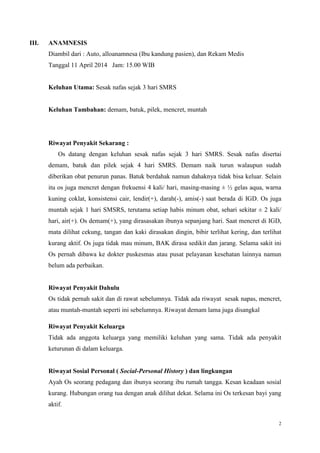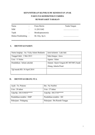 Pasien bernama Vicky Islami Budianto, seorang bayi berusia 11 bulan, mengalami bronkopneumonia dan gastroenteritis dengan gejala utama sesak napas, demam, batuk, dan muntah yang tidak membaik meskipun sudah diobati. Pemeriksaan menunjukkan kondisi gizi yang baik tetapi ada tanda dehidrasi ringan hingga sedang, serta hasil laboratorium menunjukkan anemia dan hipokalemia. Rencana pengelolaan mencakup terapi non-medis seperti tirah baring dan oksigen, serta terapi medis dengan cefotaxim dan nebulisasi.