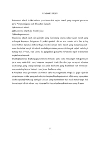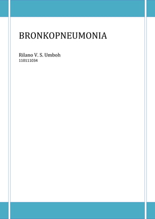 Bronkopneumonia adalah infeksi saluran pernafasan yang umum pada anak-anak, yang disebabkan oleh berbagai etiologi seperti bakteri, virus, dan jamur, serta dapat menyebabkan kematian jika tidak diobati. Penyakit ini sering dimulai dengan infeksi saluran pernapasan atas dan ditandai dengan demam tinggi, kesulitan bernapas, dan sianosis. Pencegahan termasuk menjaga daya tahan tubuh, menghindari kontak dengan penderita, dan vaksinasi.