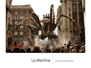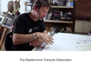 This document discusses the work of animatronic artist François Delarozière. It notes that he began creating large scale animatronic sculptures and installations in 2008 with his piece "Les Mécaniques Savantes" and in 2015 he created the piece "Long Ma Jing Shin" to celebrate 50 years of Franco-Chinese relations. The document provides links to videos of some of Delarozière's animatronic works.