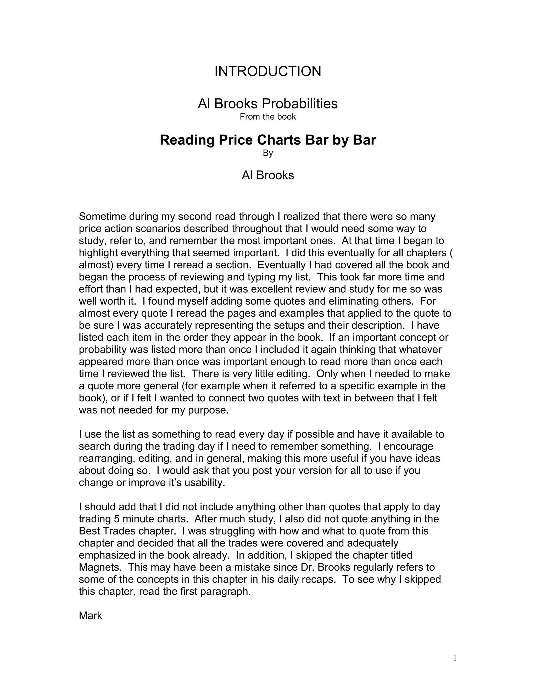 1. The document is a list of probabilities and concepts from Al Brooks' book "Reading Price Charts Bar by Bar" that the author compiled to aid in reviewing and studying the material.