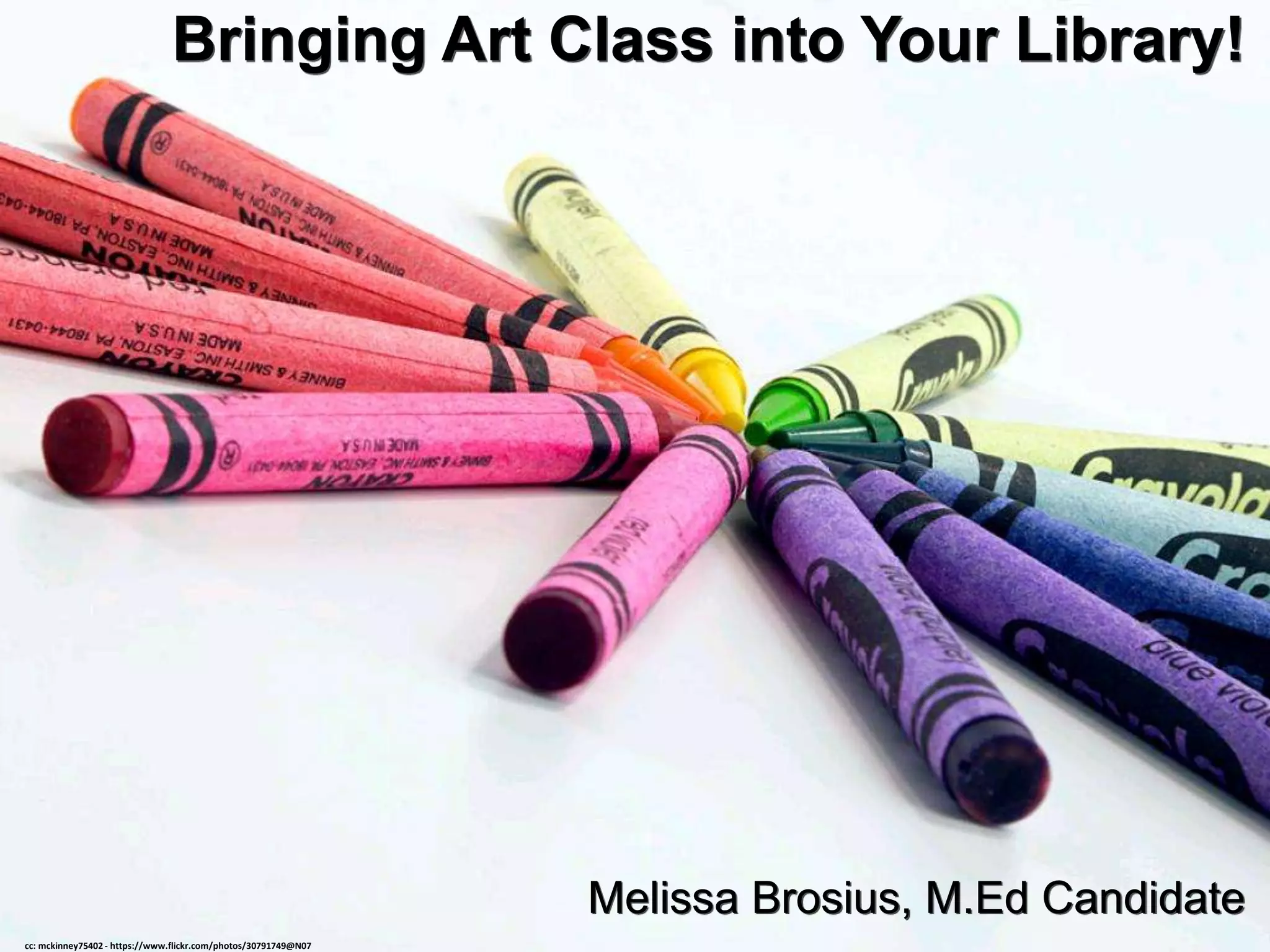 The document outlines various tools and methods for incorporating art classes in libraries, including collaboration with art teachers, projects utilizing green screens, QR codes, Ozobots, Blabberize, and Flipgrid. It emphasizes creative engagement through student projects, self-reflection, and peer critiques aligned with visual arts standards. Additionally, it provides resources and citations for further exploration of the tools mentioned.