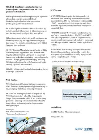 Vi fokuserer kontinuerlig på forbedring, nettverks- Les mer på www.sintef.no/manufacturing