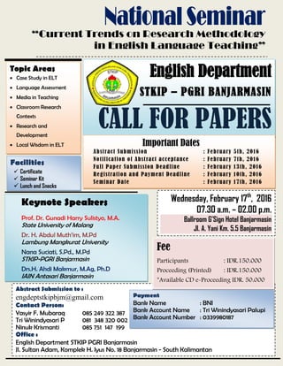 This document is a call for papers for a seminar on current trends in research methodology in English language teaching. It provides information on topic areas, important dates, registration fees, payment details, and contact information. Participants are invited to submit abstracts by February 5th, 2016 on topics related to case studies, language assessment, media, and classroom research. The seminar will be held on February 17th, 2016 at the G'Sign Hotel Banjarmasin in Banjarmasin, South Kalimantan, Indonesia.