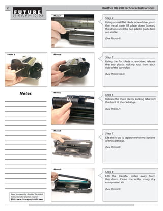This document provides technical instructions for remanufacturing the Brother DR-200 drum unit. It outlines 14 steps to disassemble the drum unit, clean its components, and reassemble it. Key steps include removing the drum and developer roller, cleaning them with compressed air or alcohol, and ensuring proper installation of gears and locking tabs during reassembly. The document also provides instructions for resetting the drum counter and lists Brother printer models that use the DR-200 drum unit.