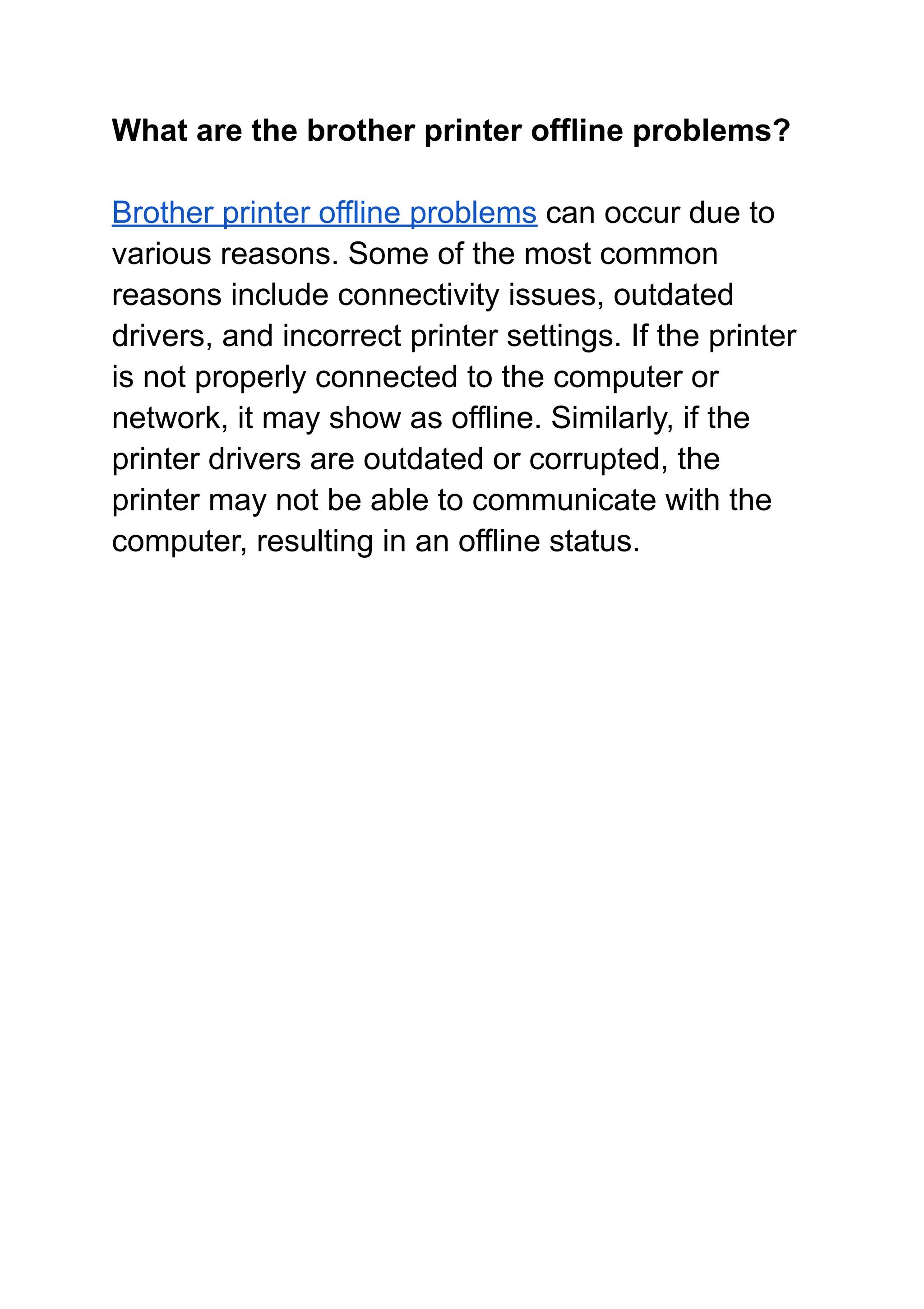 Brother printer offline problems can arise from connectivity issues, outdated drivers, or incorrect settings. If the printer isn't properly connected to the network or if the drivers are corrupted, it may appear offline. Ensuring proper connections and up-to-date drivers can help resolve these issues.