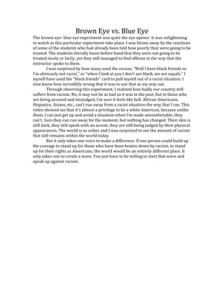 The document discusses a brown eye-blue eye experiment that highlighted continued racism. It describes how some students were offended by unfair treatment they knew was coming. It also notes that using excuses like "having black friends" does not negate racism. The experiment showed the author that racism still negatively impacts minorities daily through unfair judgments and an inability to easily avoid uncomfortable racial situations, as whites can. It concludes that speaking up against racism could help change this.