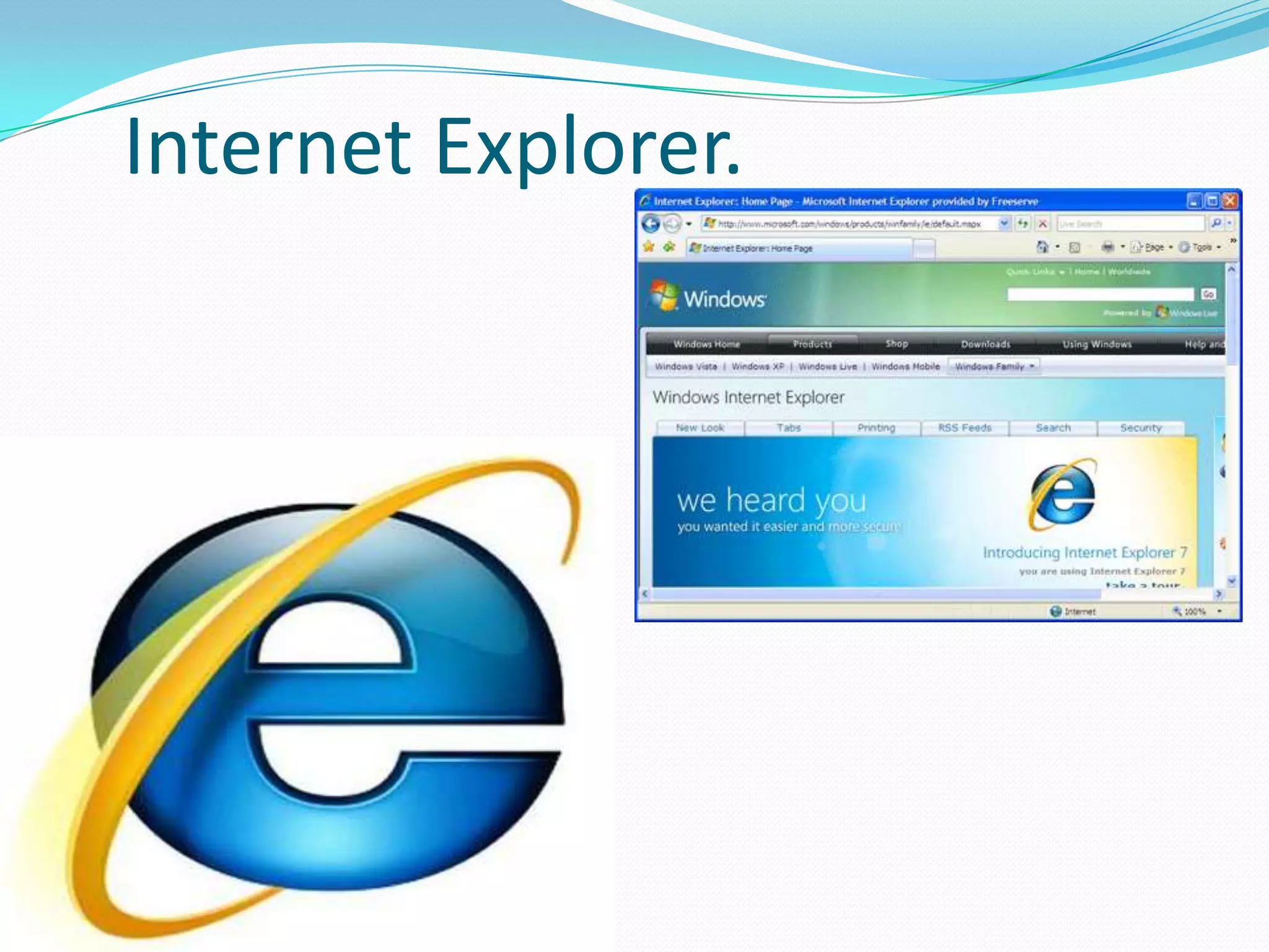 Internet Explorer is the most widely used web browser from 1999 to present, with a peak of 95% usage between 2002-2003. It provides tabbed browsing and easy RSS feed subscription.