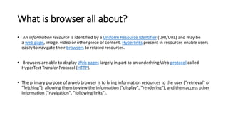 A browser allows users to view and interact with resources on the World Wide Web. It displays HTML pages and other web content by making HTTP requests and rendering the responses. Key components of a browser include a user interface, layout engine, rendering engine, JavaScript interpreter, and networking components. When a user enters a URL, the browser looks up the IP address and sends HTTP requests to retrieve and display the requested content, including linked resources. Common browser features include back/forward buttons, an address bar, and the ability to view page source. Browsers support privacy/security functions and web standards.