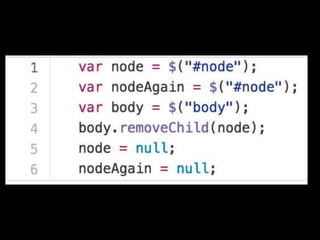 The document discusses browser internals with a focus on JavaScript development, highlighting the roles of various browser components like the DOM tree, render tree, and layout processes. It emphasizes best practices for optimizing performance, managing reflows, and memory usage within JavaScript applications. Additionally, it covers the compilation process of JavaScript within the V8 engine, including optimizations and handling of hidden classes.