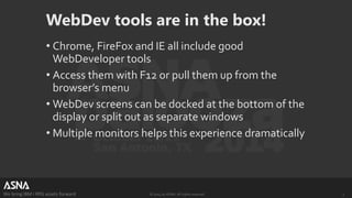 The document discusses debugging JavaScript and CSS in browser developer tools. It explains that Chrome, Firefox, and Internet Explorer all provide built-in developer tools that can be accessed with keyboard shortcuts or from the browser menu. It recommends using Firefox and Chrome's additional plugins like Firebug and Web Developer to augment the debugging experience. Internet Explorer is considered the weakest of the three browsers for development.