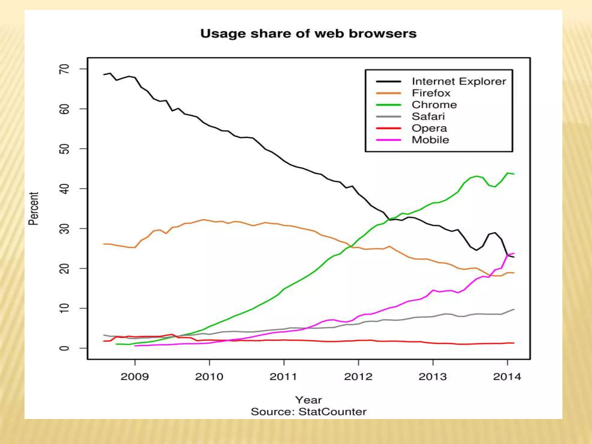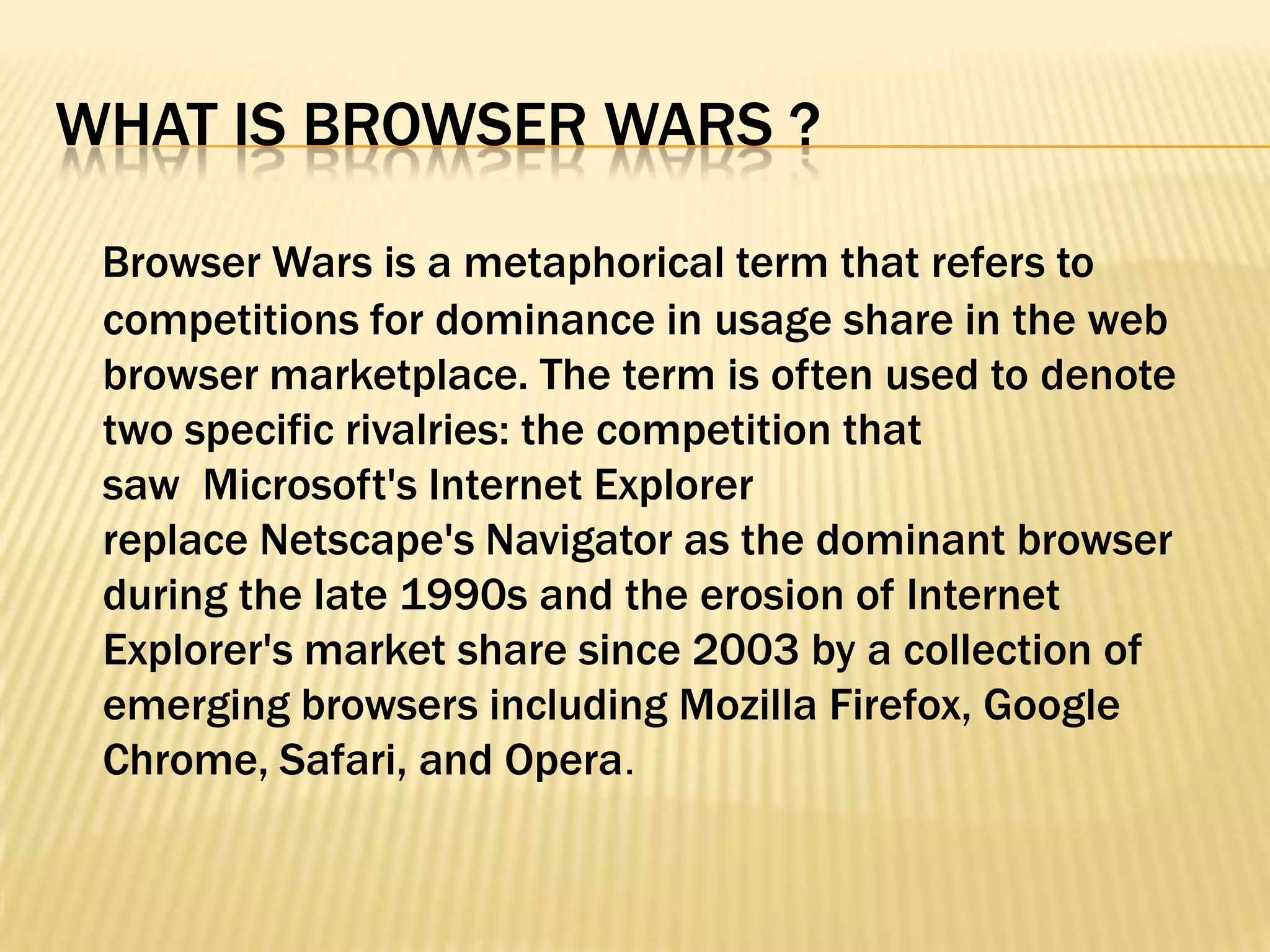 The document discusses the two major browser wars that have occurred. The first was between Netscape Navigator and Microsoft Internet Explorer in the late 1990s, which Microsoft ultimately won by bundling Internet Explorer with Windows. The second browser war began in the mid-2000s as Firefox, Chrome, Safari, and Opera gained market share from Internet Explorer through added features and innovations. Today the major browsers are Chrome, Firefox, Safari, and Edge, with Chrome having the largest market share globally.