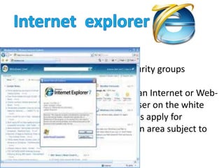 The document summarizes information about 12 different web browsers: Internet Explorer, Firefox, Chrome, Opera, Safari, Maxthon, Flock, Avant, Deepnet, Phaseout, Camino, and Seamonkey. For each browser, it provides the release year, key versions, and highlights of their security features and ease of use.
