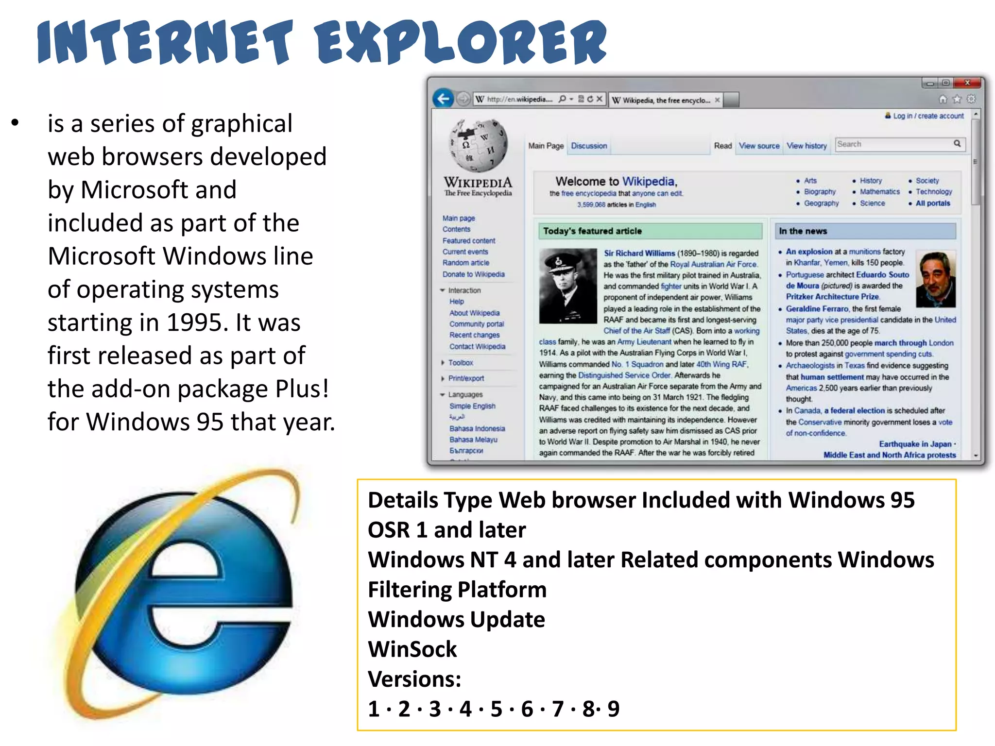 Internet Explorer is a series of graphical browsers developed by Microsoft and included in Windows operating systems starting in 1995. Mozilla Firefox is a free, open-source browser initially released in 2004 that is written in C++ and licensed under the MPL. Google Chrome is a browser developed by Google that uses the WebKit engine and was initially released in 2008.