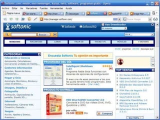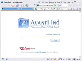 Internet Explorer, Firefox, Google Chrome, Opera, Safari, Maxthon, Flock, Avant, Deepnet, and PhaseOut are web browsers. They allow users to view websites and have features like tabbed browsing, bookmarks, privacy controls, and compatibility with different operating systems. Sea Monkey and NetSurf are also open source web browsers that are cross-platform and focus on efficiency and standards compliance. Camino is a Gecko-based browser designed specifically for Mac OS X.