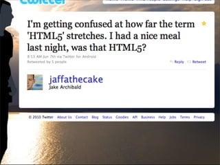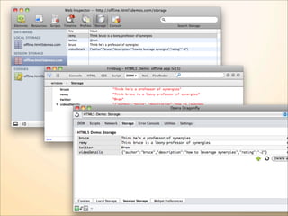 The document discusses HTML5 features and functionalities including multimedia capabilities (like video), graphics (using SVG and canvas), and various APIs for storage, geolocation, and web connectivity. It emphasizes the advantages of using modern web technologies over older methods like cookies for data storage and highlights potential issues with user experience in full-screen video playback. Additionally, it covers fallback options for offline functionality and the manifest file structure for caching assets effectively.