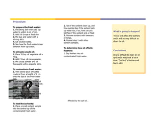 This document describes an experiment to simulate an oil spill and its effects. Students will create simulated crude oil and contaminate a fresh water dish with it. They will then test different sorbent materials to see how effectively they clean up the oil and how quickly. Feathers will also be dipped in the contaminated water to see how oil harms bird feathers and how difficult it is to clean them. The experiment aims to help students understand the challenges of cleaning up an oil spill and its impacts on birds.