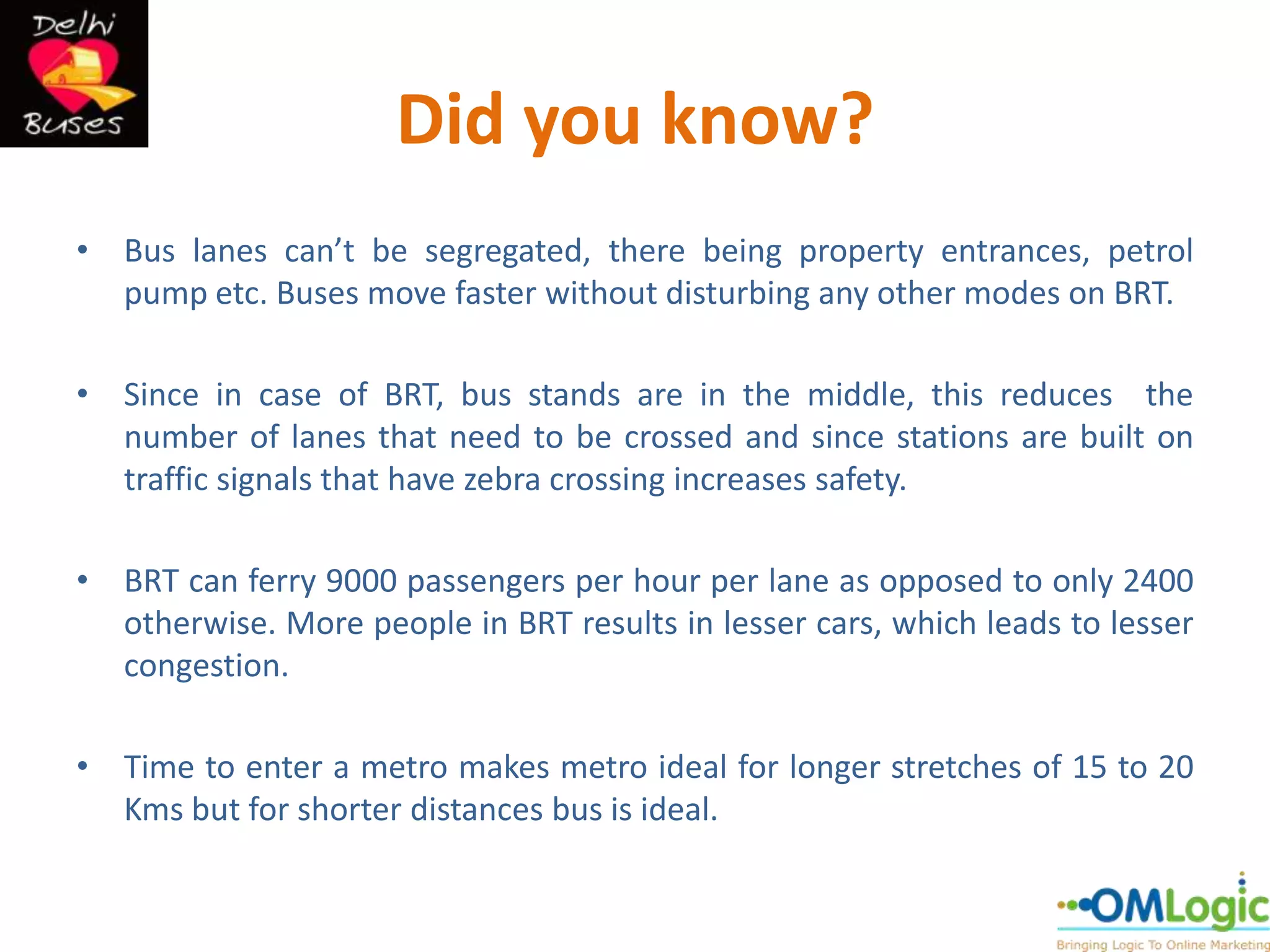 The document details facts about public transportation in Delhi, highlighting the effectiveness of Bus Rapid Transit (BRT) in reducing congestion and increasing passenger capacity compared to other modes of transport. It emphasizes that BRT can handle 9,000 passengers per hour per lane, making it more efficient for shorter distances than the metro. Additionally, it presents data on the breakdown of trips and road space allocation, indicating that buses and pedestrians dominate in terms of trips, while private motor vehicles account for only 17% of road space usage.