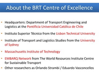 The document outlines the objectives and activities of the Bus Rapid Transit (BRT) Centre of Excellence at Pontificia Universidad Católica de Chile, emphasizing the development of guidelines for effective BRT planning and implementation. It discusses the challenges faced by traditional bus systems, the importance of user experience, and proposes strategies to improve bus services akin to metro systems through enhanced operational practices. Additionally, the document highlights the establishment of a BRT observatory and educational programs aimed at supporting transit system transformation and knowledge dissemination.