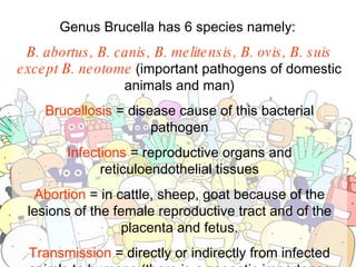 The document summarizes information about Brucella abortus, the bacterium that causes brucellosis in cattle. It describes the morphology, culture characteristics, pathogenicity, transmission between animals, diagnosis, vaccines including Strain 19, and control of B. abortus infections through vaccination and testing programs.