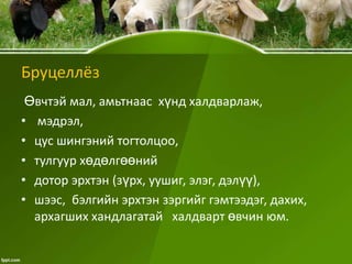 ба өвчин үүсгэгч Бруцеллёз өвчтэй • • • • • • Үхэр Гахай Хонь Ямаа Тэмээ Цаа буга зэрэг амьтдаас хүнд халдварладаг