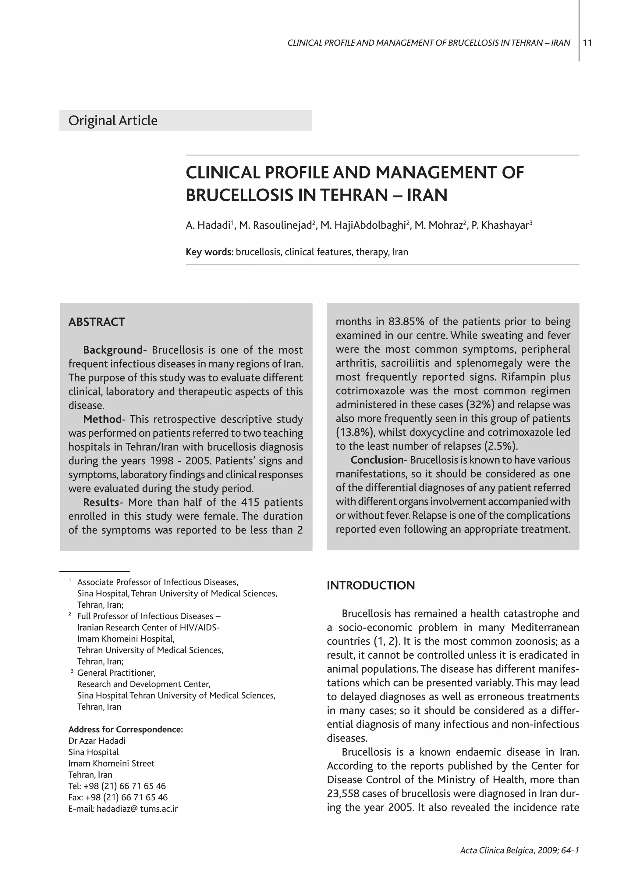 This study analyzed 415 patients with brucellosis in Tehran, Iran between 1998-2005. Most patients were female, aged 20-40 years, and had symptoms for less than 2 months. The most common symptoms were sweating and fever, while the most frequent signs were fever, arthritis, and splenomegaly. The majority of patients consumed non-pasteurized dairy products. Rifampin plus cotrimoxazole was the most common treatment, but resulted in the highest relapse rate, while doxycycline and cotrimoxazole led to the fewest relapses. Relapse remained a complication even following appropriate treatment.