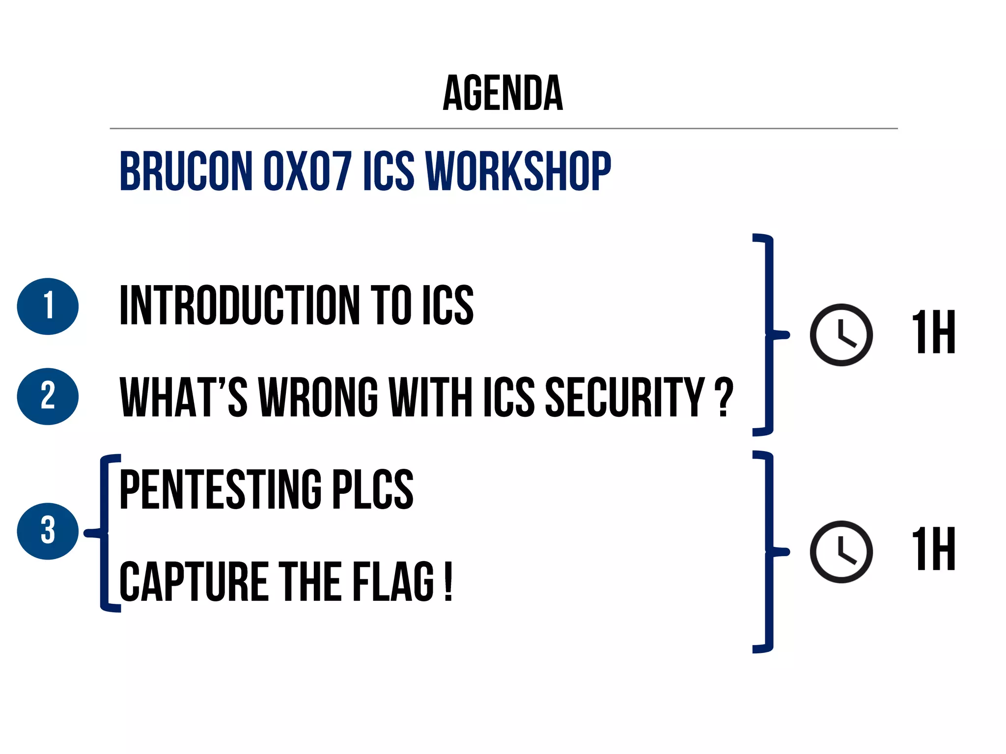 This document provides an overview of industrial control systems (ICS) and SCADA security. It introduces the speakers and defines key ICS terminology. It discusses the evolution of ICS and protocols like Modbus and S7. It outlines ICS components and the differences between IT and OT environments. It also summarizes various tools that can be used for ICS reconnaissance and protocol interaction, and provides an agenda for hands-on lab sessions covering topics like port scanning, protocol analysis and attacks.