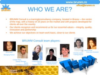 Brumm Consult is a 10-year-old training and consultancy company located in Brasov, Romania that focuses on innovative development programs and achieving results for its clients. It prides itself on values of integrity, quality, innovation and partnership. The company utilizes a team-based approach and provides training, workshops, homework assignments and on-the-job training across topics like leadership, management, sales, finances and more.