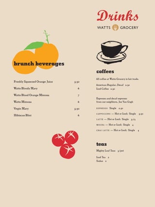 Watts Grocery is a restaurant located in Chapel Hill, North Carolina that sources many ingredients from local artisans and vendors. They serve breakfast, lunch, and dinner with seasonal menus. For brunch they offer options like eggs benedict, fried chicken on a biscuit, shrimp and grits, and huevos rancheros. They also serve coffee, tea, juices, and other drinks. Watts Grocery prioritizes supporting other small, local businesses in their area.