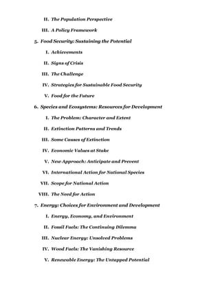 The document is a report from the World Commission on Environment and Development that outlines their findings and recommendations. It begins with an introduction from the Chairman discussing the urgent need for coordinated global action on environmental issues. It then provides a table of contents that outlines the various sections of the report, which cover topics like population, food security, energy, urban development, and proposals for institutional and legal reforms to promote sustainable development. The overall report calls for higher global cooperation and ambitious political action to address common environmental challenges and work towards a sustainable future.