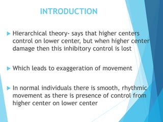 The document details the Brunnstrom Approach, a neurorehabilitation method that focuses on developing movement synergies in individuals with spasticity following neurological damage. It outlines the stages of motor recovery, associated reactions, and treatment principles aimed at enhancing voluntary movement through reflexive and proprioceptive facilitation. The document also describes specific reflexes and their implications for physical therapy in recovery processes.