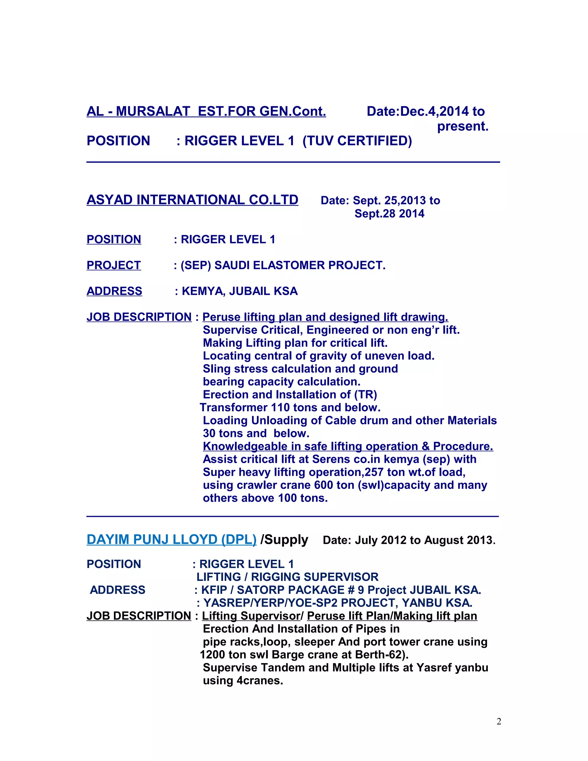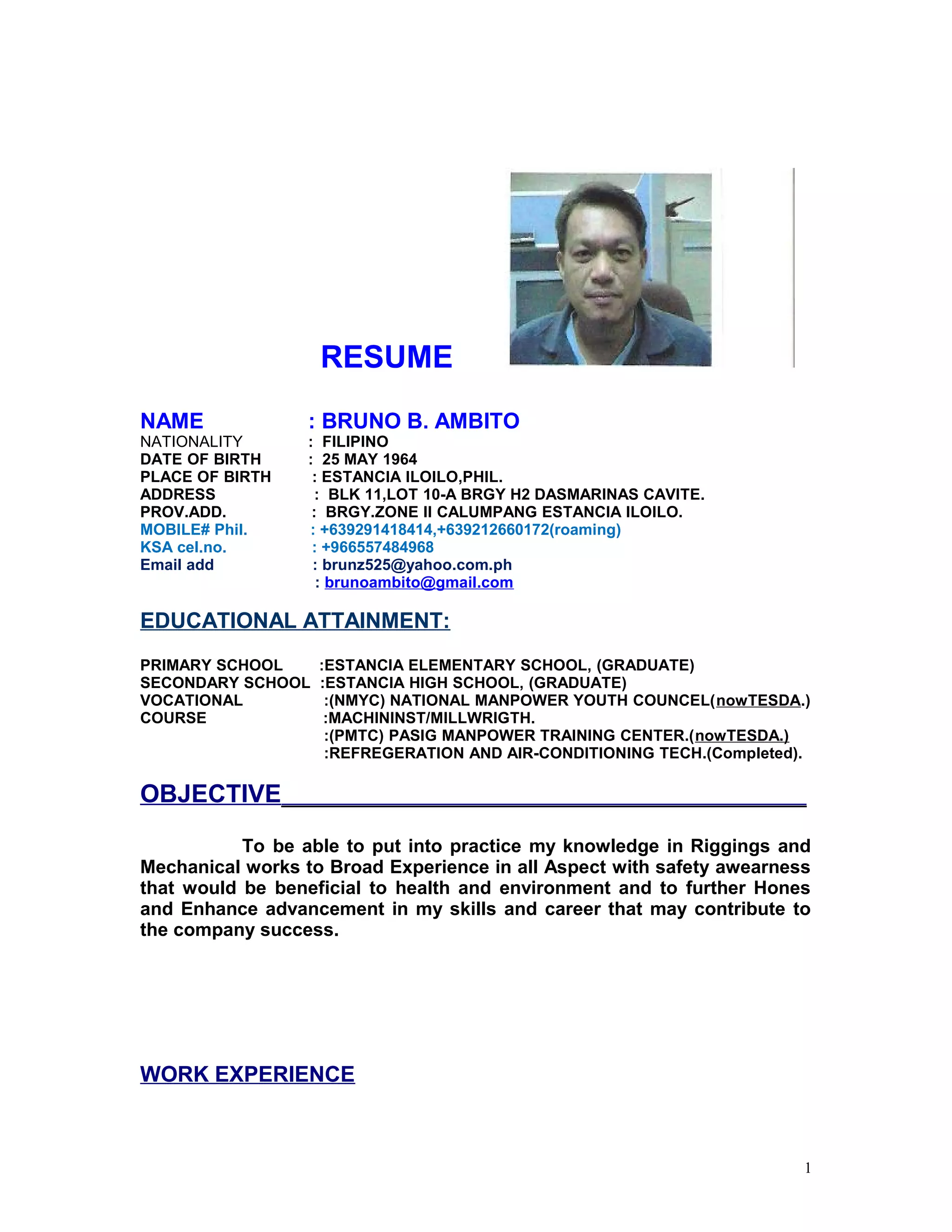 Bruno B. Ambito is a Filipino rigger with over 30 years of experience in rigging, mechanical work, and maintenance. He holds certifications as a rigger level 1 from TUV and ARAMCO. His work experience includes projects in KSA for companies such as Al-Mursalat, Asyad International, Dayim Punj Lloyd, and ISCOSA Industries where he supervised rigging operations and performed mechanical maintenance. His objective is to further develop his skills and contribute to company success with a focus on safety.