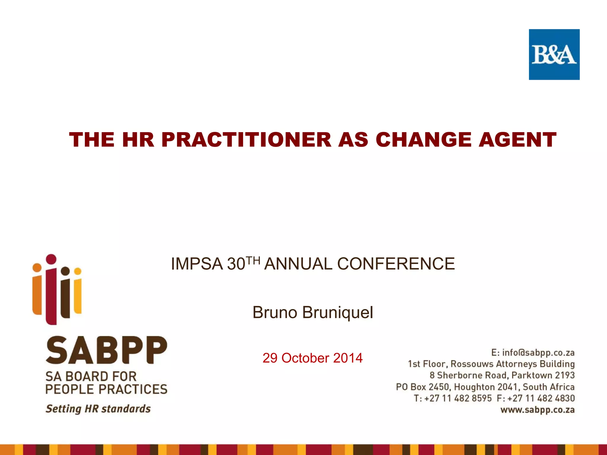 The document discusses the role of HR practitioners as change agents to improve HR practices and service delivery in local governments. It emphasizes that HR practitioners should drive the implementation of HR standards and audits to bring consistency and continuous improvement. The standards can act as a catalyst for change by providing a framework to assess current practices, identify gaps, and guide practitioners on strengthening areas like skills development, performance management, and employee relations. Regular audits against the standards will allow benchmarking progress and verifying the quality of HR practices. The document calls on HR practitioners to internalize the standards, educate others, conduct self-assessments, and work towards external audits to ultimately raise the bar on HR practices.