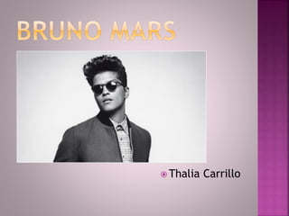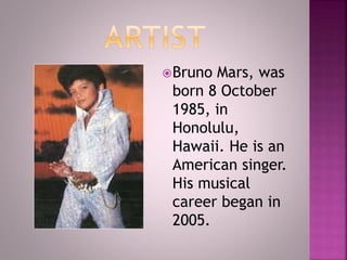 Bruno Mars is an American singer born in 1985 in Honolulu, Hawaii. His musical career began in 2005 and some of his popular songs include "Just the Way You Are" from 2010 and "Uptown Funk" from 2015. The document discusses how "Uptown Funk" is a cheerful and lively song about partying and girls that makes the listener feel happy and lively, especially when listening at parties or when in a lively mood.