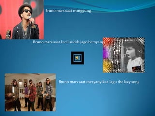 Profil Bruno Mars menampilkan foto-foto sang penyanyi sejak kecil hingga dewasa dalam berbagai kesempatan seperti konser, penghargaan, dan berbagai gaya bermusik dengan berbagai alat musik.