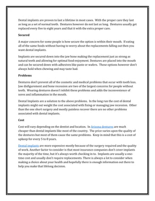 Dental implants and dentures both replace missing teeth, but they differ in important ways. Dental implants last a lifetime with proper care and are secured directly into the jawbone, allowing for normal eating. In contrast, dentures are not as secure and need replacing every 5-8 years. While implants have higher up-front costs, they prevent bone loss and other issues associated with tooth loss. Overall implants provide a more permanent and natural solution than dentures.