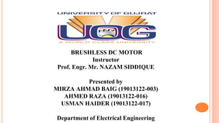 The document discusses brushless DC motors (BLDC). It explains that a BLDC motor is a permanent magnet synchronous electric motor driven by DC electricity with electronic commutation. It has a stationary stator with coils and a rotating permanent magnet rotor. Hall sensors detect the rotor position to synchronize switching of the stator coils and generate torque electronically rather than using brushes. BLDC motors are highly efficient and capable of high speeds. Common applications include computer hard drives, vehicles, industrial robots, and appliances.