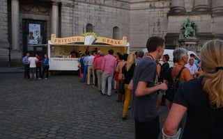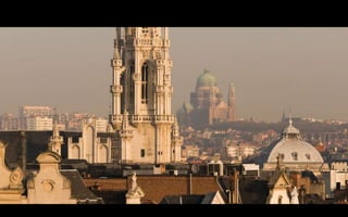 The document describes sights in Brussels including a famous statue covered in costume, the Royal Palace, Sint Niklaas church, Our-Lady-of-the-Sablon church, and an art workshop as well as mentioning a Christmas tree.