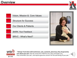 This document provides an overview of the BRVC veterinary clinic including its vision, mission, core values, clients, patients, feedback received, and future plans. The summary is: