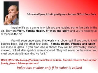 In a 30 second speech, the former CEO of Coca-Cola likened life to juggling five balls representing work, family, health, friends, and spirit. He stated that while work is flexible like a rubber ball, the other aspects of life are fragile like glass and must be balanced. He urged employees to work efficiently during office hours and leave on time to devote sufficient time to family, friends, and rest.