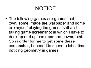 This document discusses geometry concepts seen in various video games owned and played by the author. It provides screenshots and descriptions of points, segments, parallel and perpendicular lines, planes, congruence, right angles, adjacent angles, acute and obtuse angles, alternate interior and exterior angles, and corresponding and consecutive interior angles as they appear in games like Dawn of War, Morrowind, Fallout 3, Call of Duty Black Ops, and Warhammer 40k Space Marine. The author acknowledges this was a last minute project but hopes to score at least a 75%.