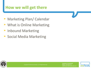 The document discusses integrating social media into a business marketing plan. It provides information on developing a marketing plan and calendar, online marketing including search engine optimization and social media. It discusses best practices for social media platforms like Facebook, Twitter, YouTube, and LinkedIn. The key aspects covered are developing social media strategies for different business goals, understanding your target audience, creating engaging content, and measuring the success of social media marketing efforts.