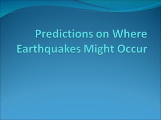 The document discusses earthquake prediction based on a student's project analyzing earthquake data. The student learned that earthquakes are not random, but occur along fault lines due to tectonic plate movement. The likelihood of earthquakes can be predicted based on factors like the type of plate boundary, the number of past quakes, and the strength of previous quakes. Based on analyzing a map of earthquake data, the student predicts specific areas that could experience future quakes, including Peru, Mexico, Greece, and California, due to a lack of recent activity and past significant quakes.