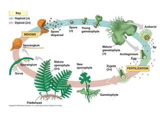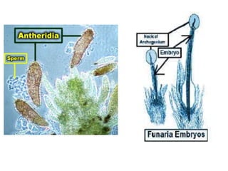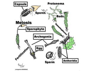 1. They reproduce via spores and have alternation of generations, where the haploid gametophyte generates gametes and the diploid sporophyte produces spores.