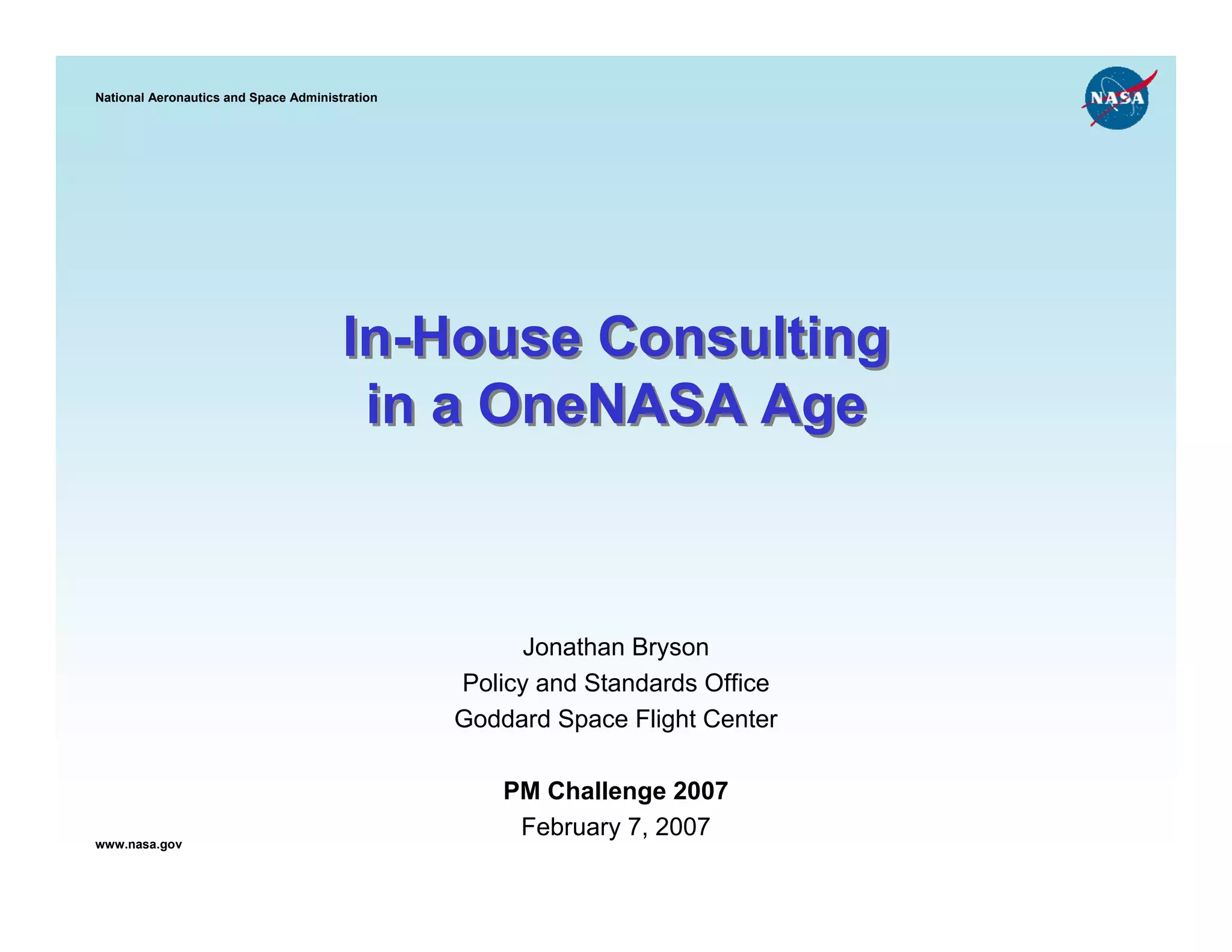 The document discusses the role of in-house consulting at NASA. It proposes that staff offices at NASA centers can take on the perspective of internal consultants by understanding project manager needs, interpreting policies, developing expertise, and providing ongoing support. This would help staff offices maintain relevance and justify their roles, rather than focusing only on processes. Examples are provided of how NASA Goddard's Policy and Standards Office takes a consulting approach to activities like Integrated Baseline Reviews. Potential benefits include improved consistency, training, and cultural alignment across NASA. Risks of undesirable roles like being an "enforcer" or "going native" are also discussed.