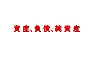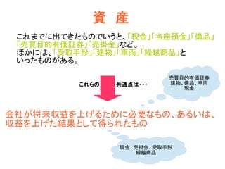 資 産 これまでに出てきたものでいうと、「現金」「当座預金」「備品」 「売買目的有価証券」「売掛金」など。 ほかには、「受取手形」「建物」「車両」「繰越商品」と いったものがある。 これらの 共通点は・・・ 会社が将来収益を上げるために必要なもの、あるいは、 収益を上げた結果として得られたもの 売買目的有価証券 建物、備品、車両 現金 現金、売掛金、受取手形 繰越商品