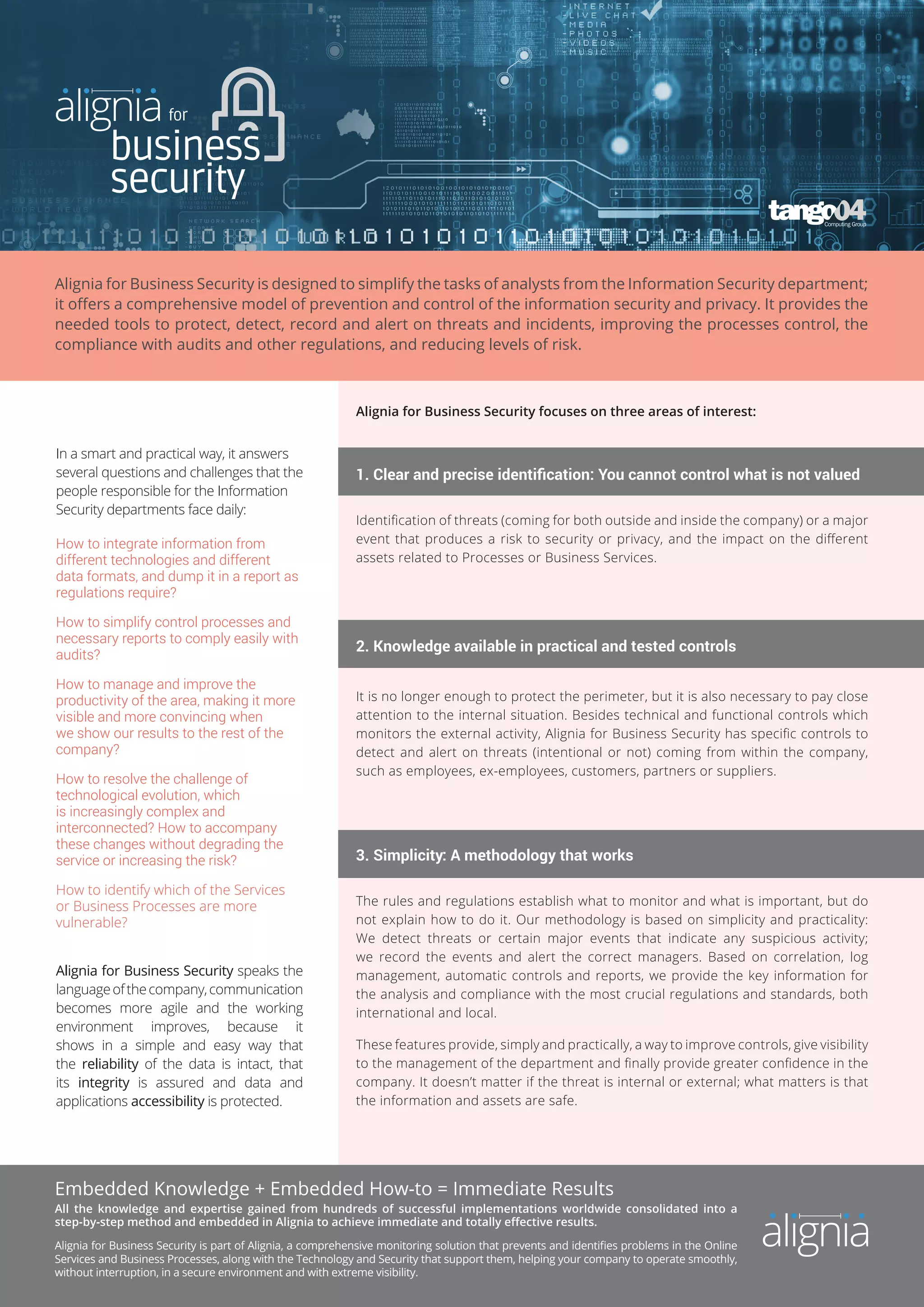 Alignia for business security simplifies the tasks of information security analysts by providing tools for the prevention and control of information security and privacy, enhancing compliance, risk management, and incident detection. It integrates various technologies to improve communication, visibility, and productivity in managing security threats, both internal and external. With a focus on practical controls and comprehensive reporting, Alignia helps businesses protect their data and meet regulatory requirements efficiently.
