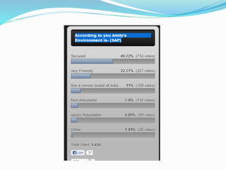 This document discusses the transition from high school to college. It first describes the initial feelings students have of independence and excitement to make new friends. It then provides tips for effective transition such as time management, avoiding conflicts, and utilizing resources. The document describes how the author depicted the transition experience through an online survey conducted with Jugaadin.com. The survey asked students about Amity University's environment. The results showed that most students found the environment to be secure and friendly. In conclusion, the survey helped students understand the adjustment needed to transition to college life.