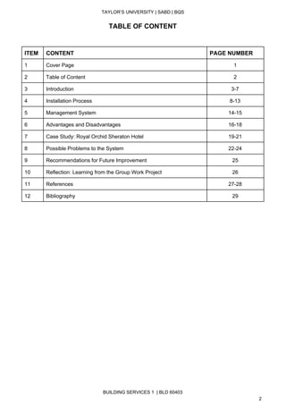 The document discusses the installation of hot water supply systems for hotel/corporate buildings. It describes centralized and localized hot water supply systems and the factors to consider for high-rise building installations, such as water consumption, peak demands, heating methods, and pipe insulation. A centralized system with a boiler tank is recommended for high demand buildings like hotels due to efficiency and convenience.